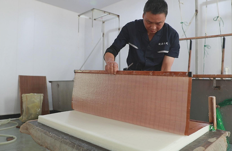 徽州楮皮紙起源于北宋,是利用當(dāng)?shù)靥赜械蔫ぶ谱鞒鲞m合書(shū)畫(huà)使用的一種紙品。2003年,非遺傳承人朱建新創(chuàng)辦公司,致力于徽州楮皮紙的傳承和發(fā)展。2018年徽州楮皮紙被錄入中國(guó)手工紙文庫(kù),2019年徽州楮皮紙制作技藝成為了黃山市非遺傳承項(xiàng)目。 徽州楮皮紙的制作主要分為6個(gè)步驟,揀料:去除黃莖